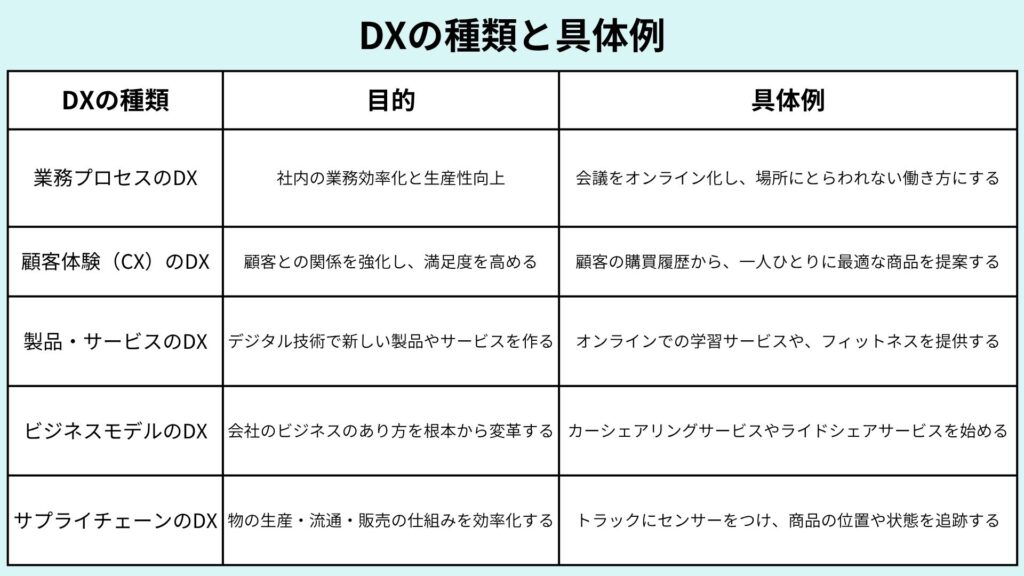 以下の表は、DXの主な種類とその具体例をまとめたものです。